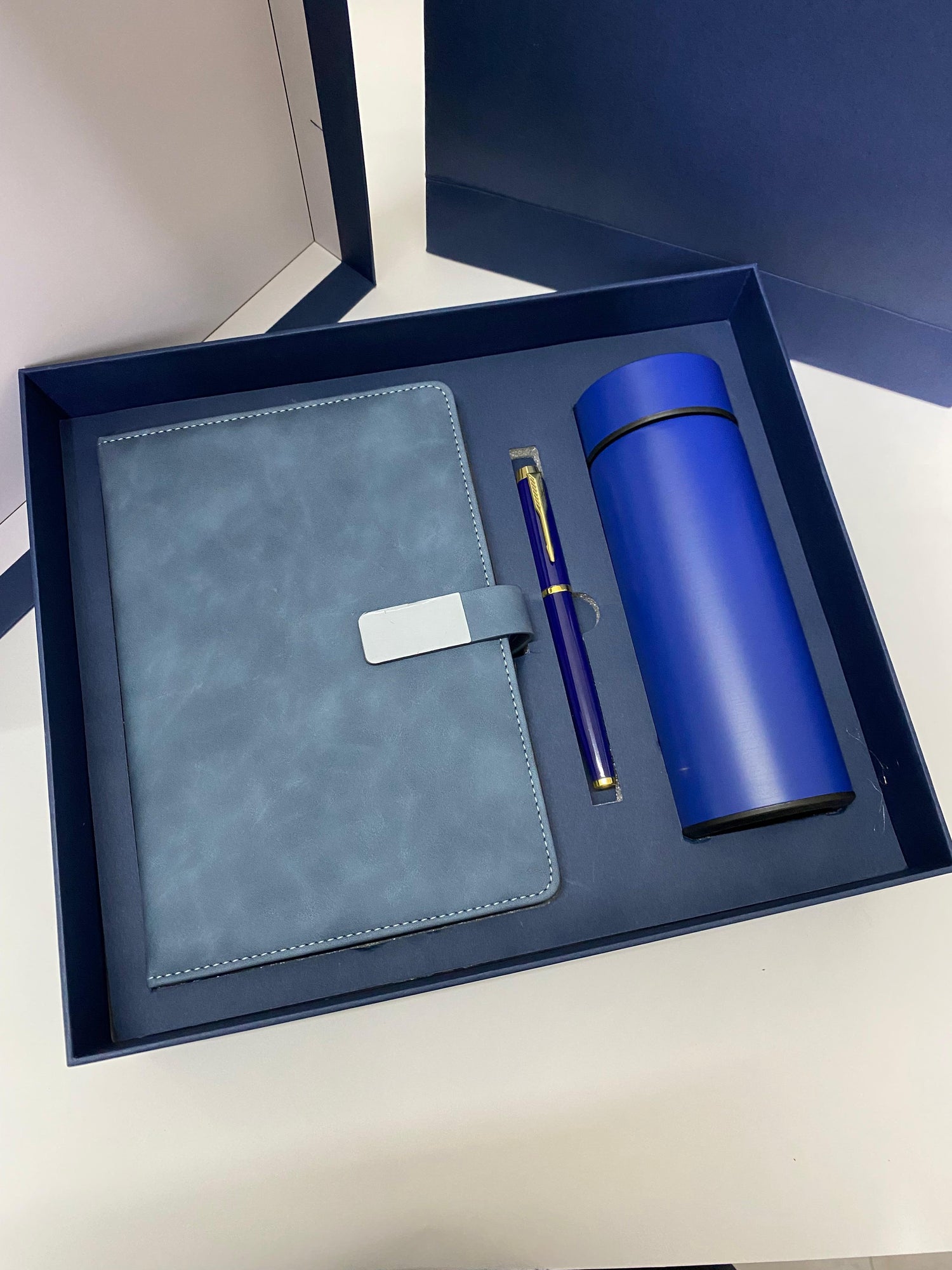 - High-quality notebook, pen, and flask set, perfect for corporate gifting