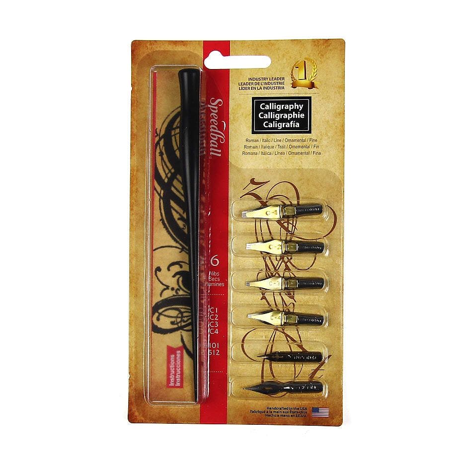 Calligraphy pen and nib set designed for Flat Roman, Italics, and Text Letters. Set includes black plastic pen holder, and nibs: C0, C1, C2, C3, C4, and C5